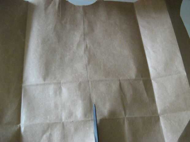 Utilizando uno de los pliegues de la bolsa de papel para guía, dibuje una línea desde un extremo del papel a la otra. Puede utilizar una regla, o puede utilizar uno de los pliegues de la bolsa de papel como guía para eyeball una línea razonablemente recta. (Señala a mi linea con un pliegue como guía).