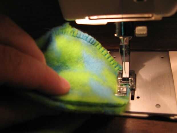 Utilicé una puntada de manta en mi máquina, pero se puede utilizar una puntada de zig-zag. (La mayoría de las máquinas tiene una puntada de zig-zag). Si sólo tienes una puntada recta, a trabajar, también. A coser en el borde mismo de las dos piezas de tela. Pasa nada si aparta demasiado profundamente en el tejido de los bordes por accidente; el forro polar todavía se extienden alrededor de la botella, y solo puede recortar a la tela sobrante lejos.
