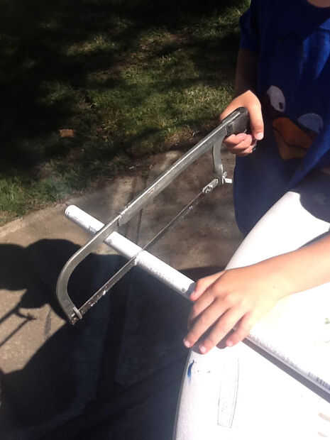 Cortar segmentos de PVC con una sierra para metales. (Mi hijo muestra cómo se hace).