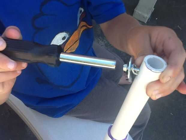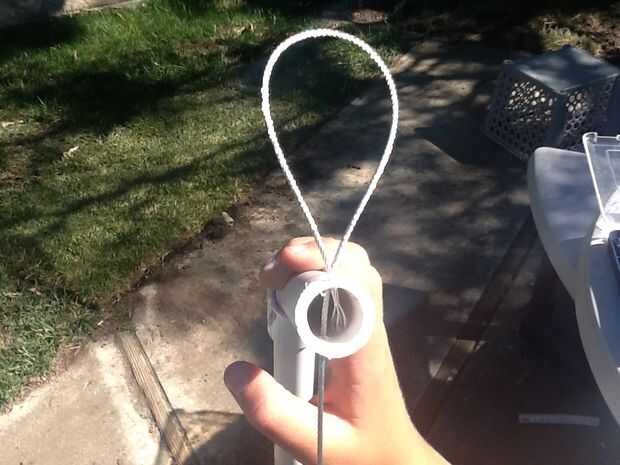 Introducir el alambre en los agujeros grasa, doblarla en forma de bucle y alimentación en el tubo de PVC a través del mismo orificio. Alicate para empujar el extremo afilado del alambre se deslice en el tubo de PVC para que no pique a nadie.