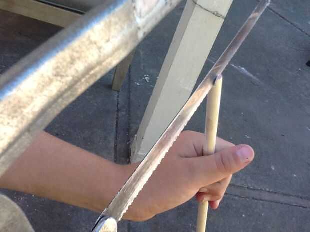 Corte una muesca en forma de v en la parte trasera de la flecha con la sierra para metales.