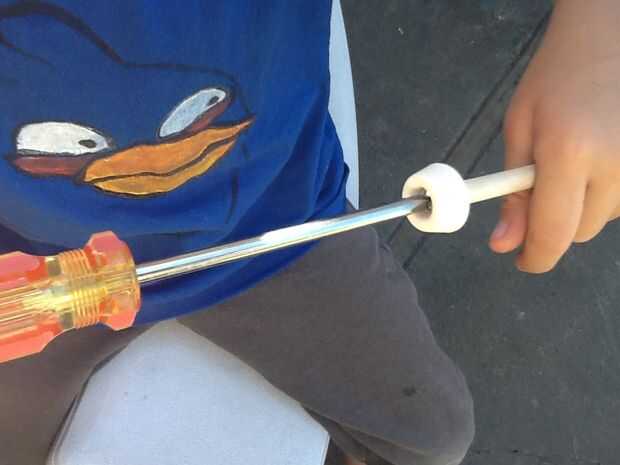 Consejo: Si utilizas el pie de plástico blanco, sumergirla en cola antes que martillo en. Si utilizas el pie de goma, utilice un tornillo largo y estrecho para evitar fisurar el pasador en lugar del tornillo gordo corto proporcionado en el paquete.