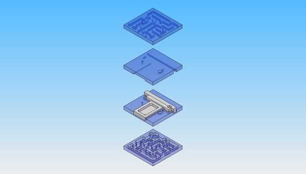 Para asegurar que el diseño funcionaría y también el laberinto de sí mismo, utilicé software CAD para el diseño del laberinto antes de cortar cualquier madera. El laberinto se construye de 7,5 "x 7.5" x. 75" tableros cuadrados, apilados 4 para un total de 3" de altura.