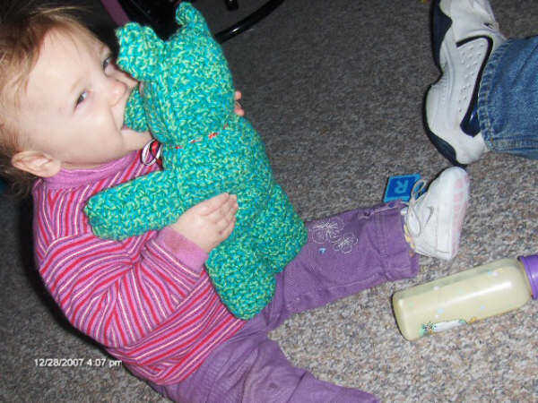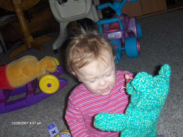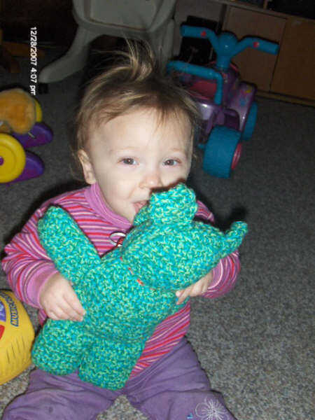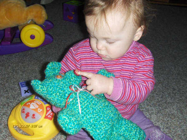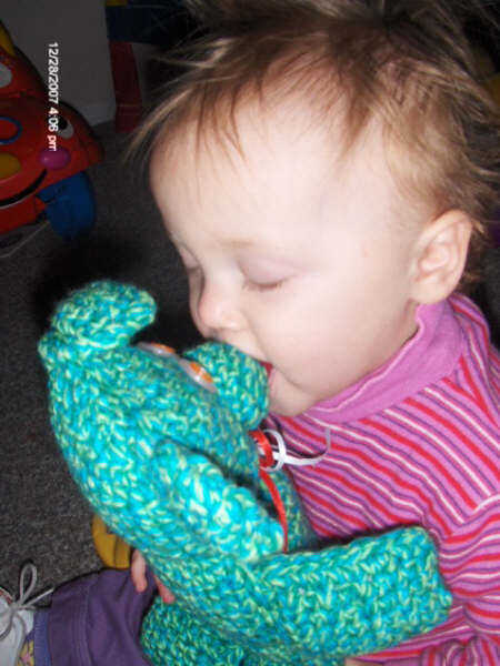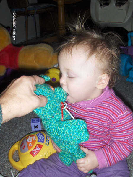 Brianna acaba de abrir su regalo de Navidad que hice para ella por lo ganchillo. He utilizado el nuevo hilo Bernat grueso Twist. Como se puede ver, tomó un bocado para asegurarse de que era bueno.