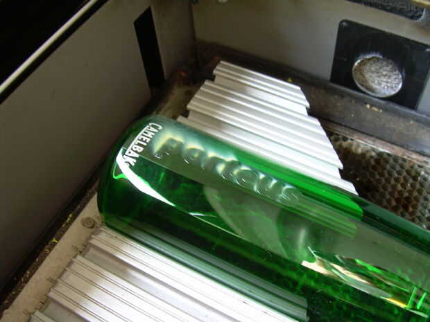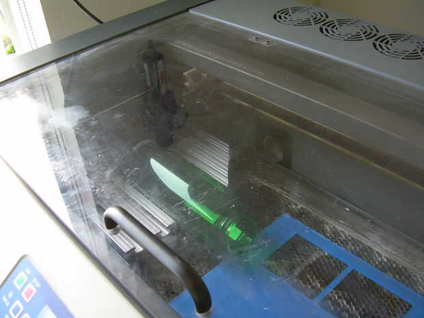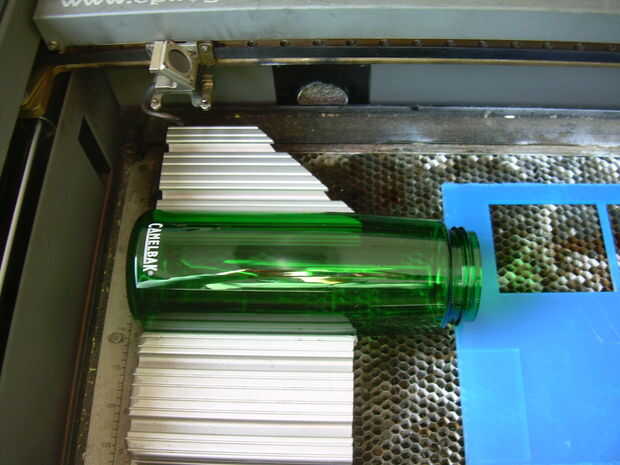 Usted necesitará asegurarse de que usted elija enfoque manual. Se trata de ajuste de la altura de la cama para que el sensor en la parte inferior de la láser no toca la botella de agua. Puesto que la botella de agua no está a nivel, el enfoque automático no funciona.