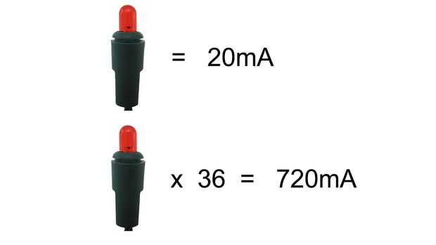 Compruebe la potencia de las luces. Si no está etiquetado se pueden estimar las necesidades actuales, basadas en el número de LEDs. LED más pequeño necesita 20mA por luz. Por lo tanto multiplicar al número de luces por 20mA. Las luces que utilizo tienen 36 LED cableado juntos en paralelo. Por lo que debe requerir 720mA.