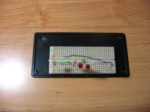 Solo pone los leds en serie. No calcular resistor para que los leds luzcan brigther. Pegue el protoboard en la puerta del caso. Yo uso pegamento loco para hacer eso. Alinee los leds para que el rayo de luz entrar en el centro del acrílico.