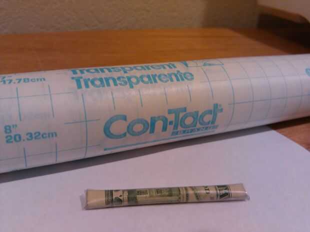 Creo que la moneda estadounidense está hecho de más de una tela que un tipo de papel, y se lo suficientemente impermeable para incrustar en jabón, pero todavía decidido para cubrir cada proyecto de ley de enrollado con papel de contacto. Además, el papel pegajoso mantuvo el proyecto de ley firmemente rodado mientras que el jabón fue vertido sobre él. Yo también laminado en el proyecto de ley de tal manera para mantener el valor de la cuenta de demostración en el exterior doblando el proyecto de ley medio primero y balanceo de los lados abiertos exterior en hacia el borde doblado de la cuenta.