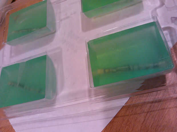 Puse cada una en cuenta en el contenedor del molde de jabón y cubierta cada una con el jabón de "Derretir y verter" derretido en un pyrex de vidrio por el microondas. Tuve cuidado para solo llenar los moldes hasta la mitad con el jabón derretido, porque el proyecto de ley en flotará en ella. Llenar los moldes hasta la parte superior daría lugar a los sobrinos y sobrinas a retirar dicho dinero sólo después de un tiempo de lavado, y necesitaba trabajar para él.