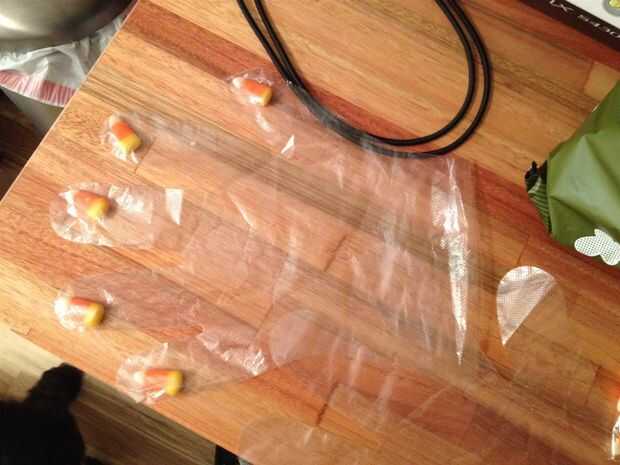 me encanta Halloween, pero quién tiene dinero para gastar en decoración. Esta mi idea para la decoración fácil moderno barata.Lo que se necesita:1. foamballs en cualquier tienda de dólar2. caramelo - usaba maíz de caramelo pero puede usar cualquier c