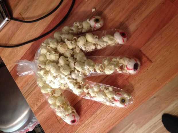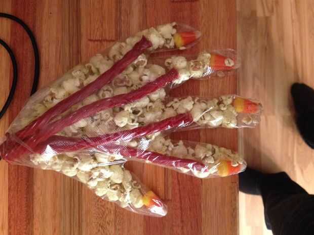 Esto es adaptable para diferentes efectos. En lugar de maíz de caramelo utilicé ojos gomosos en los extremos de un guante. En otra pongo twizzlers como venas.