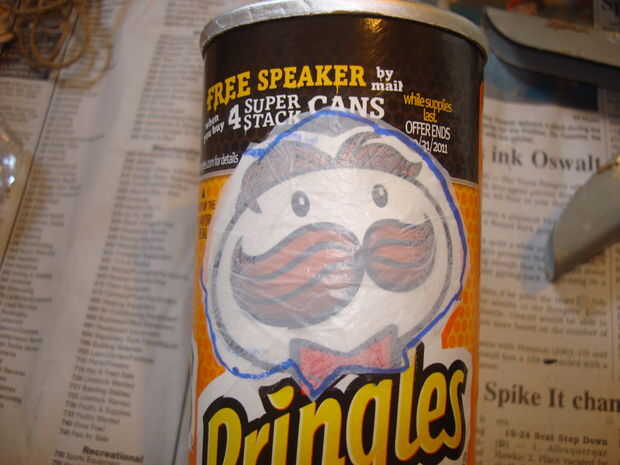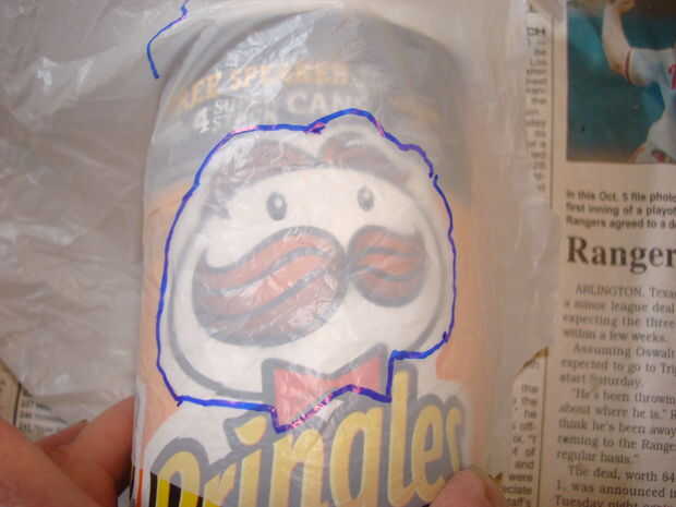 Coloque un pedazo pequeño de la bolsa de plástico sobre el hombre de Pringles y le delinear con el marcador