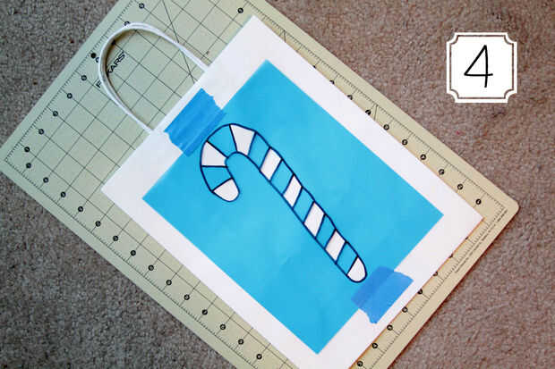 Una vez que haya terminado de cortar sus piezas, centro de la plantilla sobre la bolsa. Cinta adhesiva hacia abajo con cinta de pintor. Esto mismo la sostenga en su lugar mientras usted pintura.