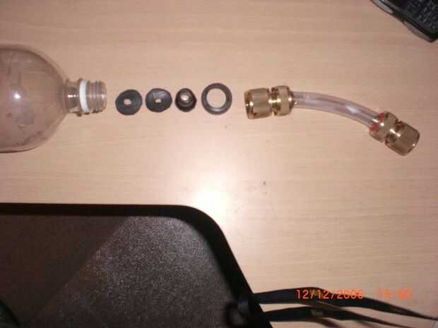 El tanque de alta presión puede contener aproximadamente 120 PSI, obviamente se hace fuera de una antigua botella de bebida del animal doméstico. Para realizar la conexión en la tapa que tienes que hacer un agujero del tamaño de los hombros de un rápido acoplamiento de conexión y corte el resto de los acoplamientos que no caben en la tapa, luego poner arandelas para sellar completamente. La manguera y conectores: el primer conector es solo normal pero al final uno tiene una válvula por lo que cuando lo desconecte de la gasolinera todo permanece en el recipiente.