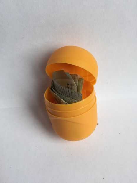 Tomar el huevo amarillo y sacar el original-a menudo inútil ;) - regalo y sustituirlo con alguno de los tuyos! En este ejemplo, lo reemplacé con un billete de 5 euros. También podría dejar el huevo amarillo y reemplazarla por ejemplo con algo totalmente diferente, como algunas joyas.