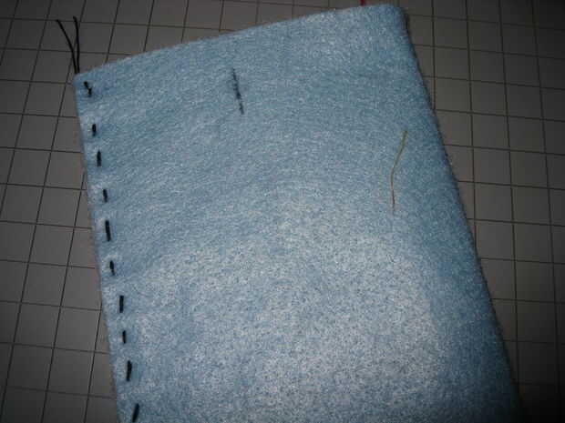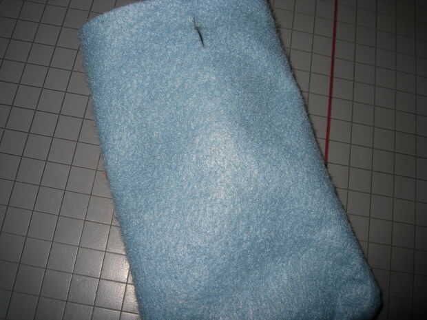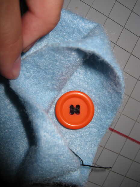 3.) coser el botón en el interior de la bolsa de fieltro, así que si la bolsa era plana peek el botón de la línea de corte, presione el botón a través del agujero un par de veces, para estirar un poco el fieltro.