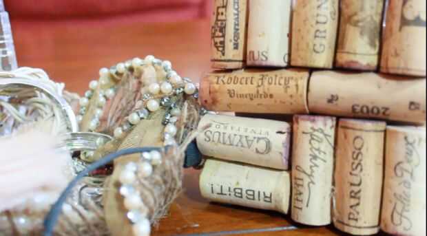 Tapones de corcho, vidrio, pistola de pegamento caliente, cartón de vino