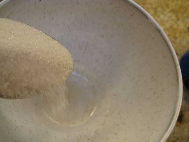 1.) en su recipiente, añadir 3 cucharadas de azúcar blanco de caña.