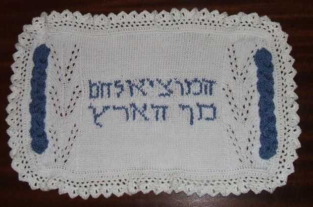 Yo de punto de la cubierta de la Jalá (con un ribete de ganchillo) para el regalo de un 12 años de edad amigo de la familia Bat Mitzvah, adaptar un patrón de Internet y utilizando algodón mercerizado blanco y azul, tamaño 3 agujas de tejer y un ganchillo tamaño F. Para la próxima vez cuando utilizo más de un color en un patrón que hace punto, podré controlar más fácilmente la tensión.