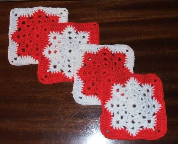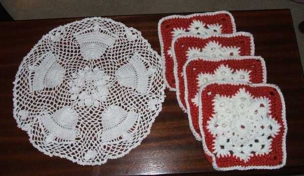 Las campana hilo ganchillo tapete y copo de nieve montañas rusas eran para viejos y queridos amigos. Los posavasos están adaptados del patrón de copo de nieve tomaollas de Linda, uso de hilo brillante, festivo. El tapete había usado #30 ganchillo hilo y un ganchillo #7. Los prácticos de Costa utiliza hilado peso estambre blanco, doble deporte peso rojo hilo y un gancho de crochet de tamaño G.