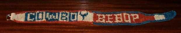 Primero es un cinturón con temática de "Cowboy Bebop" (serie de anime) para un amigo de 20 año de edad. Punto la correa usando el hilado de León ante , tamaño ganchillo gancho y un patrón de banda a vaquera. El receptor dijo que ella ha colgado el cinturón en su dormitorio de la Universidad, junto con sus carteles de pared.