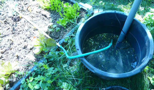 De la bomba se conecta una manguera a la boquilla de diy en mi plantbed y si nos fijamos en la imagen por completo, verás que sale bastante agua: de hecho, unos 7 litros por minuto.