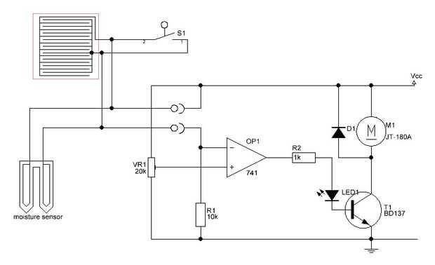 El otro sensor es un sensor de lluvia. Si el suelo está seco, pero es lluvia concientes, parece inútil empezar a regar. Otra vez el sensor de lluvia, como el interruptor de flotador, engaña el op-amp para que piensen el suelo está bastante mojado y no bombeará.