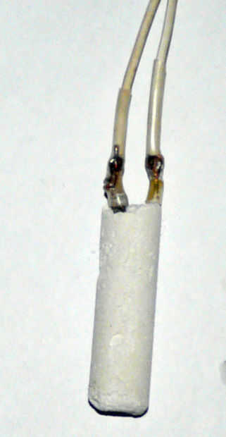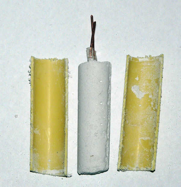 Ahora tienes una pieza de yeso con dos copperwires pegarse hacia fuera, en parte cubierto con encogimiento del calor.