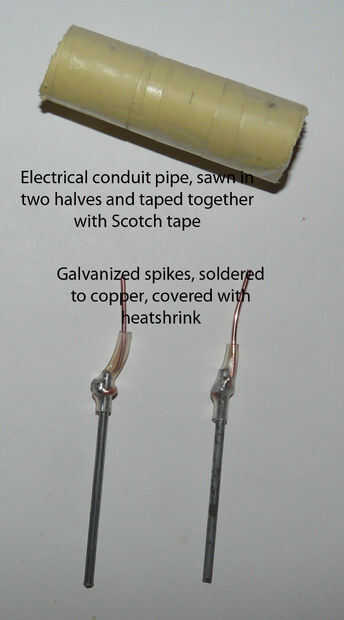 La razón por qué yo he soldado cobreAlambre a las púas galvanizadas en lugar de simplemente soldar el cable directamente a él, es porque al final es un poco más fácil de lo que es de alambre de púas galvanizados de la soldadura la soldadura de alambre al cobre. La conexión entre el cobre y el material galvanizado es fortificada por el termo retráctil y montage en yeso. Yo podría haber hecho por supuesto ya con el cable, pero luego sería difícil curar la gysum en un horno porque el aislamiento de los metros de alambre se derretirían.
