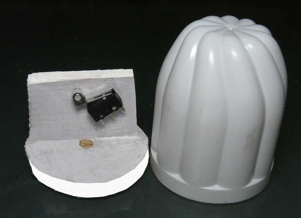 Os adjunto un microinterruptor palanca a una pieza vertical de madera, pegado en una ronda de bottem madera. En el bottem es un agujero a través del cual pasa un hilo de nylon: un lado está conectado al interruptor, el otro lado está conectado a un objeto flotante. Podría ser un patito de goma o un trozo de madera. El dispositivo está protegido de los elementos de un cono de plástico que venía de una lata de aerosol de crema batida. Todo el dispositivo está suspendido sobre el depósito de agua. La longitud de la cadena determina el nivel en que se cierra el interruptor.