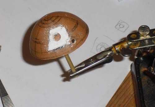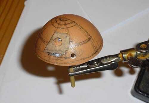 1. a partir de la decoración de la cabeza: esta vez perforado el agujero primero! :-).. .y luego cortar la forma alrededor. Intentó dibujar líneas para indicar la altura de cada decoración adicional, luego perforar un agujero de 3mm para el diodo azul.