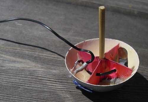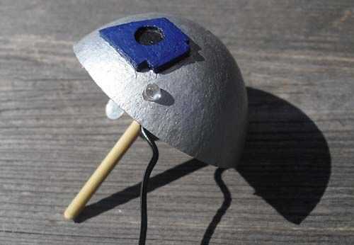 3. aquí se puede ver el dispositivo eléctrico completo: en el centro conectan el diodo azul y una batería de 3V.