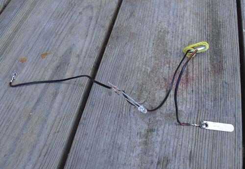 5. pega el diodo a la cabeza y fija los cables (el palillo más largo del diodo es el plus, para ir al positivo de la batería).