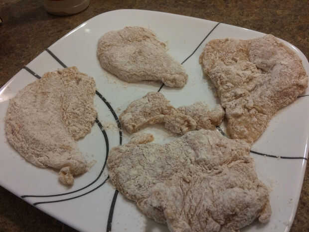 Pollo frito es super simple hacer en casa. Este pollo en particular fue dos pechos deshuesados, sin piel he descongelado y cortado en tamaños más manejables. Entonces ellos marinadas en suero de leche, salsa picante y pimienta negra. Use suficiente suero de leche para la salsa de pollo y caliente de la capa y pimienta al gusto. Pollo si disfrute de al menos seis horas o hasta 24 horas.