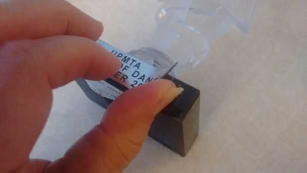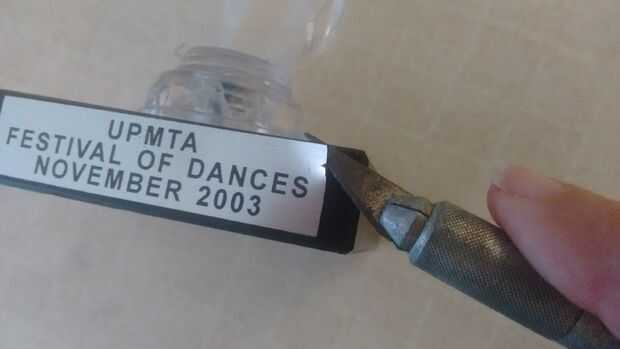 Las etiquetas de base se hacen generalmente de una pieza que de metal flexible adherido en la placa base. Para quitarla, basta con insertar la punta de un cuchillo X-acto y palanquee suavemente una de las esquinas. Una vez que se va, es bastante fácil solo pelar justo al lado.
