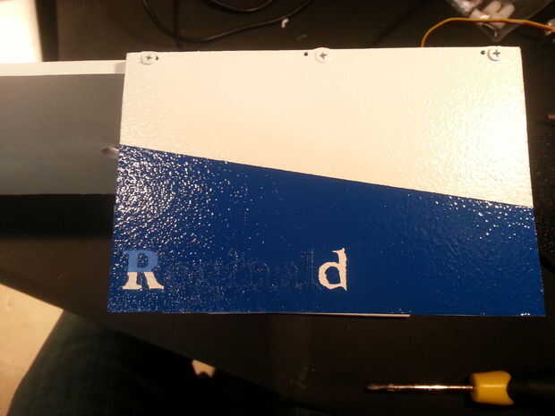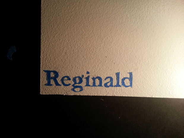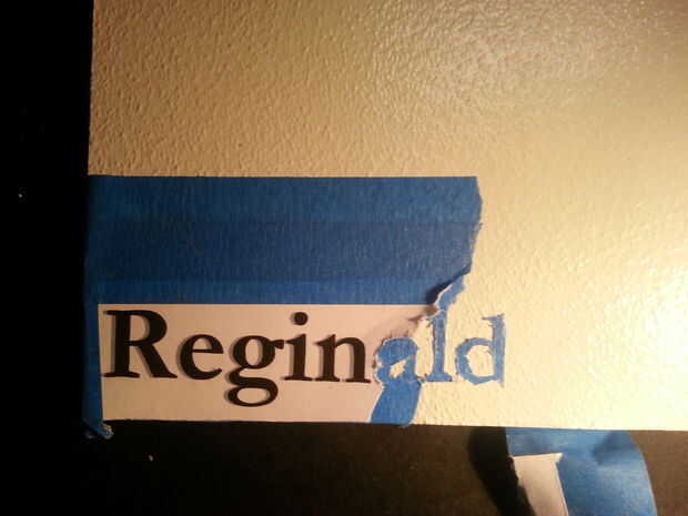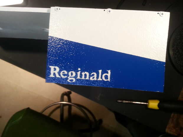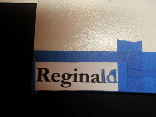 "Reginald" letras era laborioso para ser modesto. Primero graba el panel lateral con cinta de pintor e impreso de "Reginald" en Letras de fantasía. Me cortó la palabra y grabó encima de la cinta del panel lateral. En ese momento tomé una maquinilla de afeitar y cortar lentamente alrededor de las letras y la cinta de la peladura apagado debajo. Me tomó cerca de 3 horas para hacer esto! Luego había pintado azul y había pelado la cinta para las letras, dejando el texto blanco.