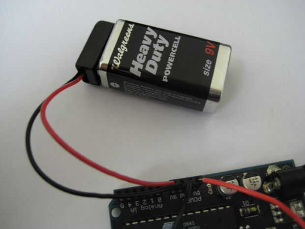 Conecte el positivo de la batería terminal enchufe de 9V en el arduino y a tierra. Asegure todo dentro de la caja para que los terminales no pueden tocar accidentalmente. Para terminar, cerrar el caso.
