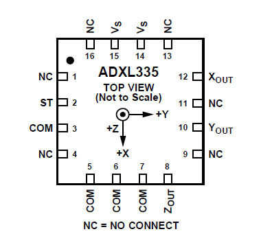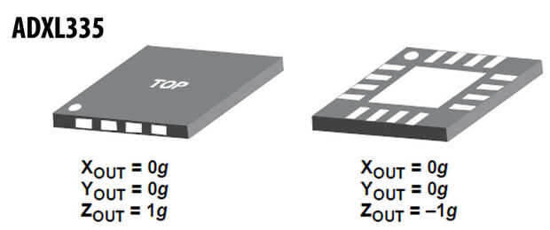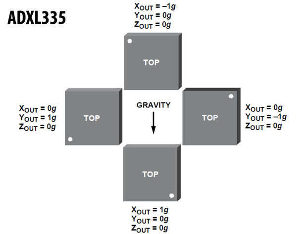 El acelerómetro puede medir la aceleración de gravedad estático (1g) así como aplicaciones de sensor de inclinación y aceleración dinámica resultante de movimiento, choque o vibración. Cuyo eje de la ADXL335 informa 1g depende de cómo se coloca el chip.