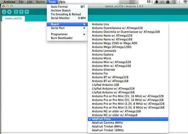 También seleccionar la Junta utiliza haciendo clic en herramientas > Junta Directiva > Adafruit Flora