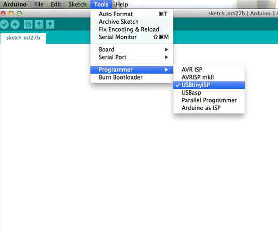 A continuación seleccione el tipo de programador haciendo clic en herramientas > Programador > USBtinyISP