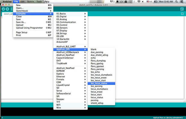 Coloque la biblioteca descargada en la carpeta de bibliotecas/Arduino/y renombrar a "Adafruit_GPS" reinicie el IDE. Una vez que reinicie el IDE Asegúrese que ves en el ejemplo de la opción de Adafruit_GPS como se muestra en la pantalla por encima.