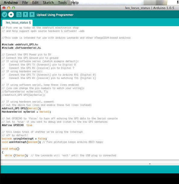 Para cargar el código/bosquejo para registrar los datos de ubicación, ir a archivo > ejemplo > Adafruit GPS -> leo_locus_status