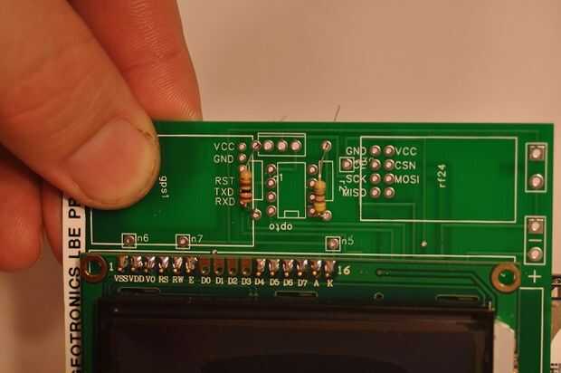 2. Suelde los 2 grupos de 6 clavijas en la parte delantera del PWB para el LCD. No suelde LCD todavía.