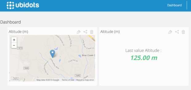 He subido mi bosquejo actual que comenzar. Para obtener el trabajo de parte de Ubidots, generar una API key para su cuenta (ver documentación de Ubidots arriba si te quedas atascado), luego crear una "fuente" como Edison y una "variable" llamada altitud. Añadir tu WiFi especificaciones, API key y variable clave para el bosquejo que proporcionado en lugar de la s de "xxxxx". En el salpicadero de Ubidots, añadir un widget, seleccione su "fuente" (Edison) y la "variable" (altitud) y luego añadir un widget de "mapa" para mostrar la ubicación más reciente o el rastro de"mapa" para mostrar la ruta de contexto de la "variable" (altitud). Esto debe crear dos widgets en el tablero de instrumentos, una vez con el rastro de ubicación o mapa y uno con la altitud actual.