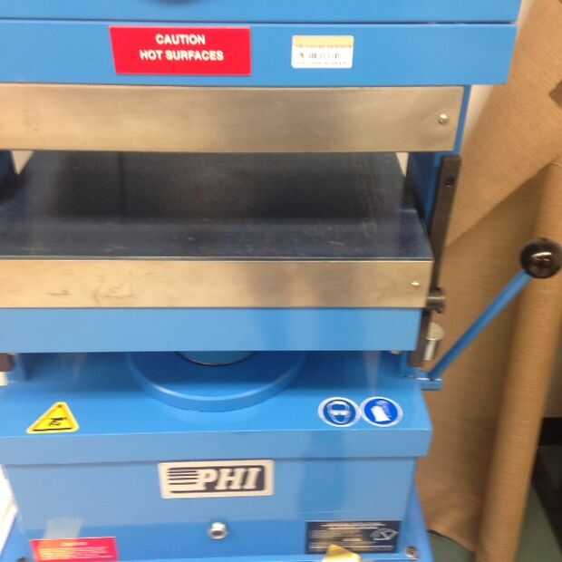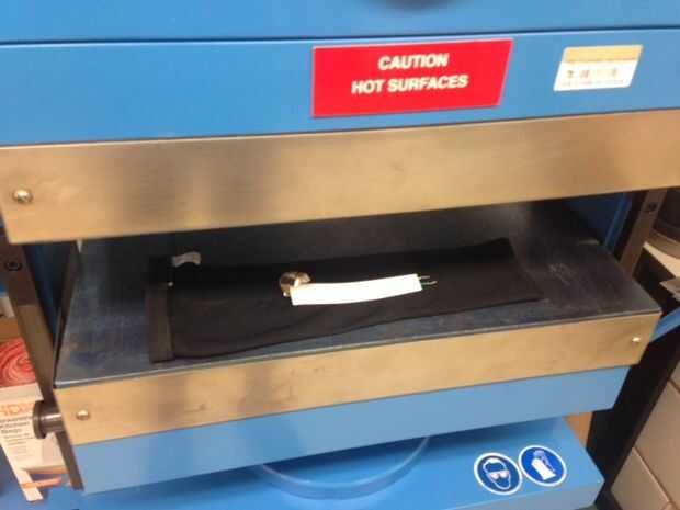 El vinilo se establecerá en el uso de una máquina de la prensa de calor, que puede ser encontrada en una tienda de la camiseta o comprar en línea http://www.uscutter.com/Heat-Presses?view_all para acerca de $200-$300. La prensa del calor debe ajustarse a aproximadamente 310 - 320F. Colocar la tela, los cables y vinilo de transferencia de calor en la máquina de la prensa del calor, se baja la platina de la prensa calentado de calor para comprimir y calentar los materiales. Los materiales deben ser comprimidos durante aproximadamente 10-20 segundos para que el vinilo se ha derretido completamente.