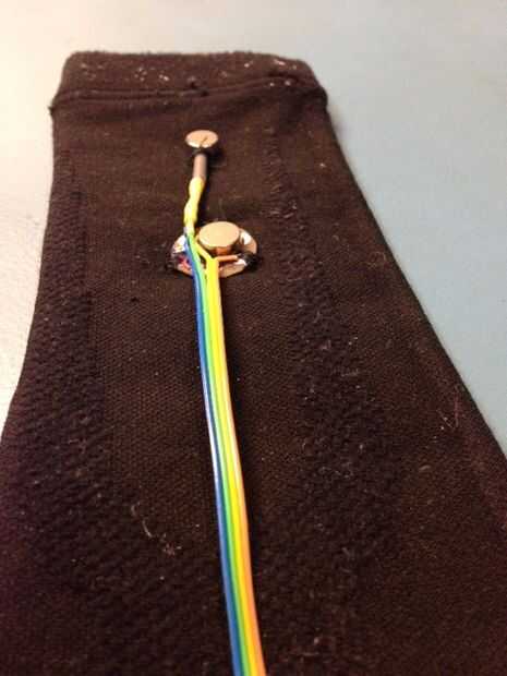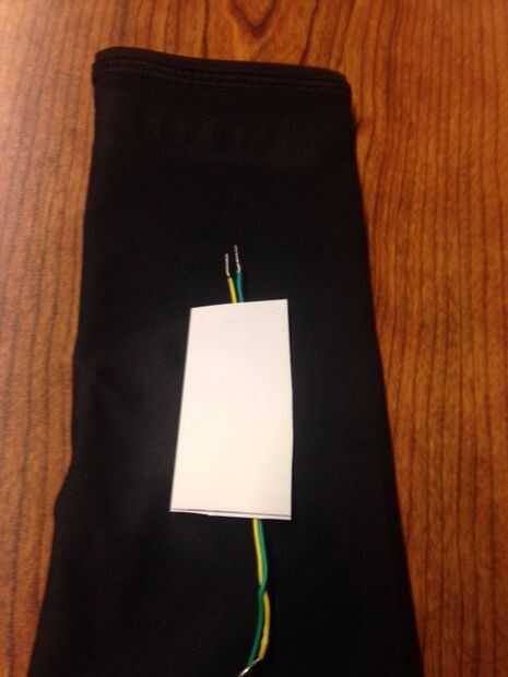 Primer diseño del donde desea que los cables de cinta y sensores incrustados en la manga del brazo. Yo he colocado el sensor de temperatura y vibración motor más cercano a la zona de la muñeca y los cables en el centro de la tela.
