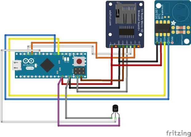 El esquema muestra cómo los diversos componentes fueron conectados juntos. Todos los tableros de circuito tenía pernos encabezado soldados en modo conexión podría hacerse con conectores de Dupont. Las sondas de temperatura vinieron con cerca de 1m de cable con los cables pelados a las cuales yo también soldado conectores de Dupont. Alimentación para la tarjeta SD y la RTC fue Margarita de la placa de Arduino para facilitar las conexiones.