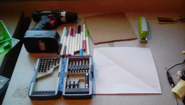 1 taladro (inalámbrico es el mejor) 2:Drill bits (yo usé un poco de cabeza plana) 3:Stapler 4:cardboard (cualquiera lo utilicé cartón corrugado) 5; papel (cortados en cuadritos) 6:Lots de marcadores!!!