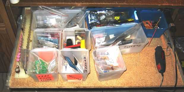 En el lado izquierdo de la plataforma de las partes, puede ver una tira larga de plástico. Se trata de un soporte que hice para mis herramientas de Dremel-clon cheapy. Básicamente, sólo perforé un montón de agujeros (de unos tamaños diferentes) para sostener las diferentes herramientas.