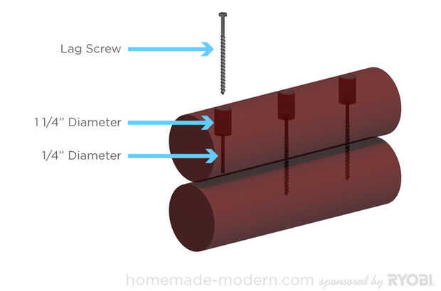 Uso la 1 ¼" broca para perforar orificios grandes a 1-2 pulgadas en el registro. Estos agujeros permiten utilizar tornillos más cortos. Tendrás los agujeros para ser lo suficientemente profundo para permitir que los tornillos entrar en el registro de segundo por lo menos de 2,5 pulgadas. Utilice el largo ¼" broca para perforar agujeros guía en el primer registro sólo.